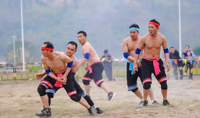 隨後,主裁判長點燃賽事花炮,象征團結奮進的拼搏精神薪火相傳,一場別開生面的花炮比賽正式開賽,來自左州鎮的4支隊伍率先展開激烈角逐。對陣雙方奮力撲搶、嚴密防守、快速進攻,投進花籃,選手們以力量與智慧生動展現著這項「東方橄欖球」運動的獨特魅力。賽場內鑼鼓聲、助威聲、歡呼聲不絕於耳,觀眾隨著比賽的跌宕起伏或歡呼或鼓掌。