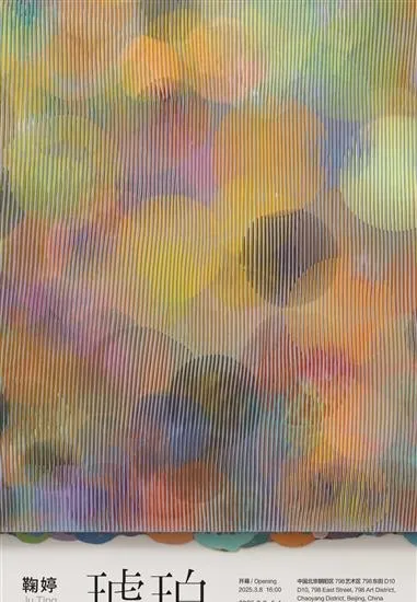 在798舉辦的鞠婷最新個展「琥珀」,展出了她2025年創作的三幅【琥珀】系列新作和一幅【深流】系列新作三聯畫。【琥珀】系列始於2019年,是鞠婷藝術道路上極具代表性的創作脈絡之一。這次的新作中,色彩豐富的圓形圖案透過層層疊加充滿畫面,它們帶著一分朦朧一分飄曳,畫面像是透過雨滴斑駁的擋風玻璃所看見的城市中的萬家燈火,一道道的刻痕似乎復現了現實中城市的川流不息的意向。