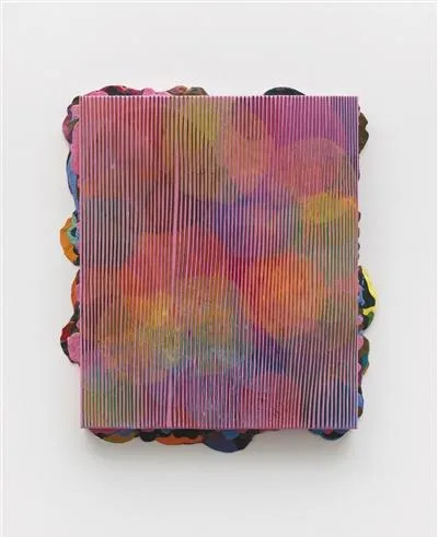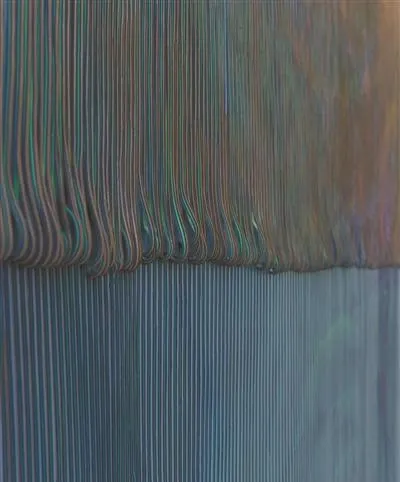 第一次看到鞠婷【珍珠】系列作品時,我沒有辦法用任何已知術語,比如構圖、顏色、符號、風格、流派和手法來描述這幅作品。畫面上布滿縱向的線條般的坑谷,像是開啟一個個母貝時發現裹有珍珠的瞬間——這可能就是取名「珍珠」的原因。坑谷敞開的顏色像是母貝裏的幻彩,恍如仙境。這種開啟時的驚喜像是藝術家的視角,而從觀眾的角度來說,畫板上敞開的條條坑谷更像是藝術家深耕出的思考:平面之下被覆蓋的波瀾。它們是藝術家用不同顏色丙烯顏料一層又一層覆蓋木板表面的結果;是一層顏色幹透之後,再覆上另外一層的行為藝術。待疊加效果達到預期後,鞠婷開始「作畫」,也就是用刻刀劈開這些疊加的顏色層。由於每一層顏料平塗時薄厚的不同,縱向開啟時呈現的紋路都是隨機和偶然的。這是藝術家的刻意,也是天意。