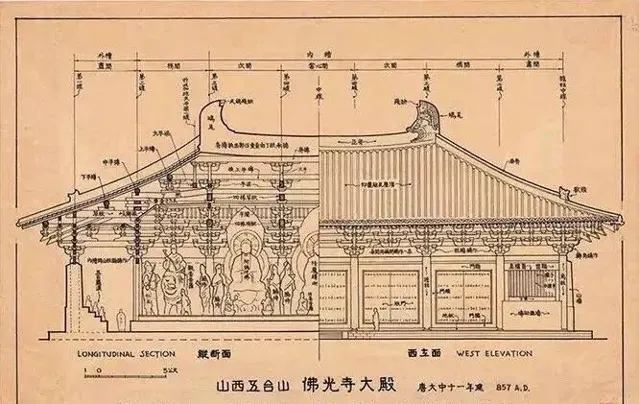 梁思成先生繪制的佛光寺東大殿正立面(剖面)圖 圖源:微博@手繪線上