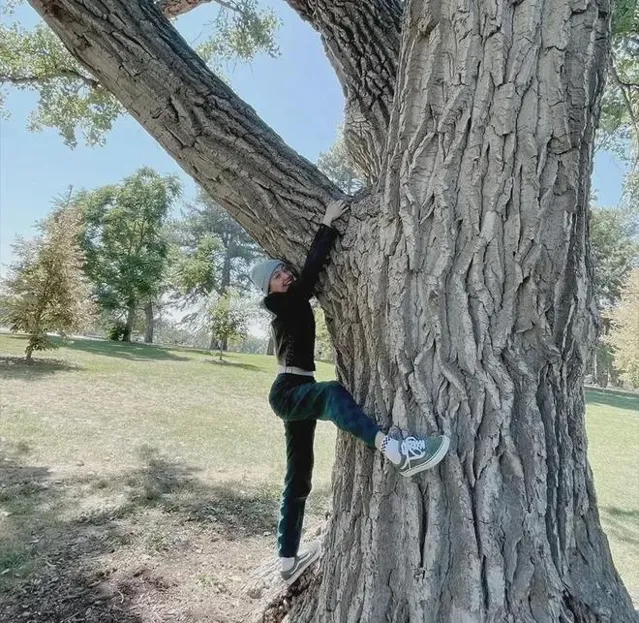 33歲的鄭爽身穿黑色休閑運動裝,頭戴灰色針織帽,腳踩一雙隨意的休閑鞋,笑容燦爛,做著各種搞怪的手勢,仿佛回到了那個無憂無慮的青春時代。