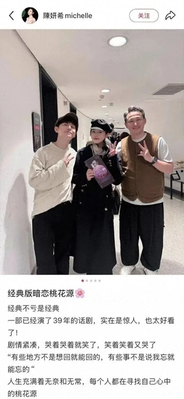 這場引發熱議的觀劇行為,恰似開啟陳妍希情感世界的解碼器。不同於多數藝人遭遇婚變時的閃躲回避,她始終保持著工作室帳號的規律更新,甚至在輿情最洶湧時仍堅持分享日常VLOG。這種近乎執拗的坦蕩,恰與【暗戀桃花源】中反復探討的「執念「主題形成奇妙互文。當觀眾翻開這部由賴聲川創作的經典話劇檔案,會發現其自1986年首演至今已在全球上演超過千場,單是2023年就有37組明星卡司輪番登台。劇中兩個劇組的空間錯位,暗合著現實人生中那些求而不得的永恒困境——就像江濱柳與雲之凡被戰火撕裂的半生情緣,亦如老陶在理想桃花源與現實破碎間的永恒徘徊。