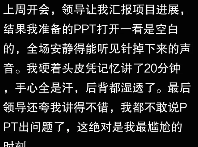 有次公司年會,我上台表演節目,結果剛開口就忘詞了,楞在那裏足足一分鐘。台下同事都看著我,我緊張得滿頭大汗,最後只好尷尬地鞠了個躬下台。那天晚上回家,我躺在床上翻來覆去睡不著,越想越覺得丟人,連續好幾天都不敢直視同事的眼睛。