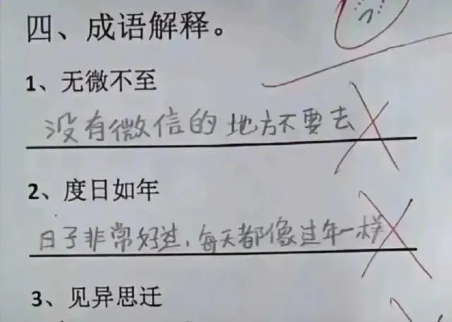更絕的是成語解釋題,什麽「度日如年」=日子非常好過,每天都想過年一樣。
