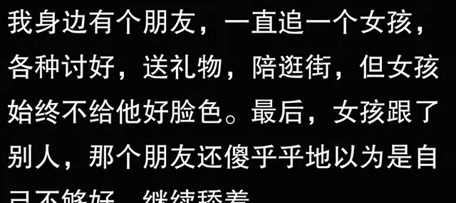 有一次,我身邊有個哥們兒,整天對女神百依百順,女神讓他幹嘛他就幹嘛。最後女神找了個條件更好的,那哥們兒還傻乎乎的笑,說女神終於找到真愛了。