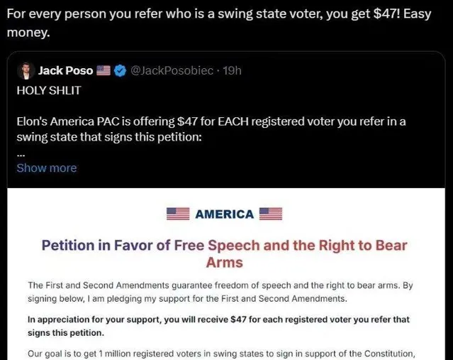 馬斯克創立的政治行動委員會公布了一個驚天動地的計劃:凡是成功推薦搖擺州選民簽署特定請願書的人,都將獲得47美元的獎勵。
