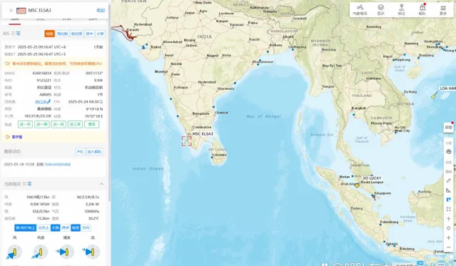 據hiFleet航運大數據顯示,這艘1728箱位的貨櫃船MSC ELSA 3號(1997年波蘭建造,懸掛賴比瑞亞國旗)於5月23號台北時間夜間從VIZHINJAM POINT附近港口出發前往COCHIN,海上航行了接近300海裏,平均速度只有3.88節。台北時間5月24號下午三點該船在接近目的港前開始停航和漂航,其AIS數據在台北時間5月25號5點消失在hiFleet平台數據上。