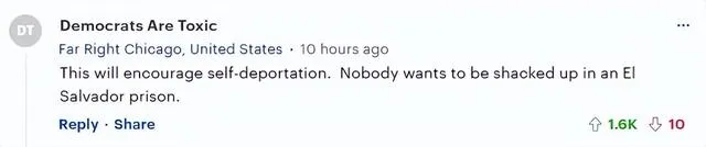 「這肯定能鼓勵他們(非法移民)把自己驅逐出去。沒有人願意關在薩爾瓦多監獄。」