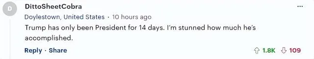 「川普剛上任14天就已經做了這麽多事,我很震驚。」