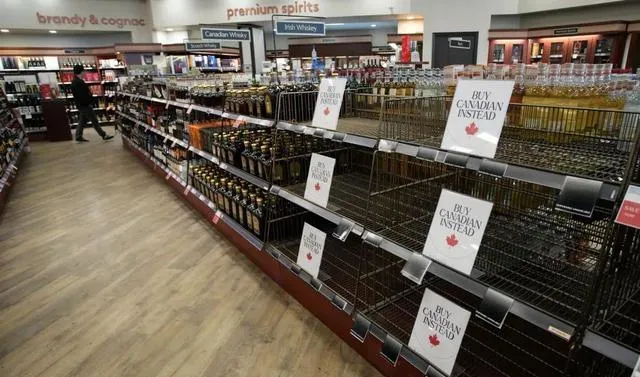 3月10日,在加拿大溫哥華一家酒類專賣店內,曾擺放美國酒類產品的空貨架上放置著支持購買加拿大商品的告示。新華社發(梁森攝)
