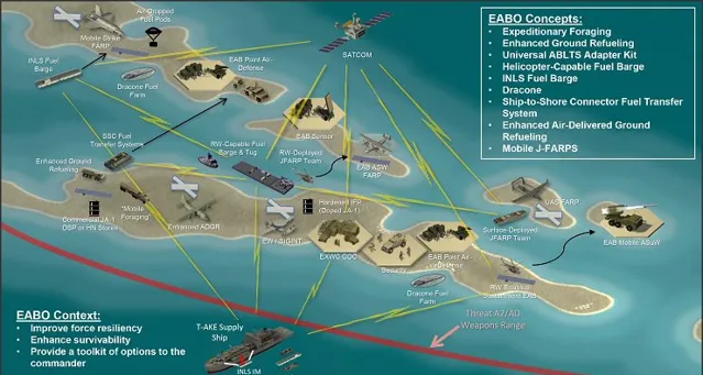 這種思路的核心是EABO模式,相比於冷戰時期的基地依賴型作戰模式,EABO 更加強調 靈活性、機動性和小規模高效打擊能力。傳統作戰模式通常依賴於大型基地、固定後勤補給和集中火力,而EABO 采取的是 「遊擊戰」+「科技戰」 的混合模式,使得美軍即使在高威脅環境下,也能保持戰鬥力。