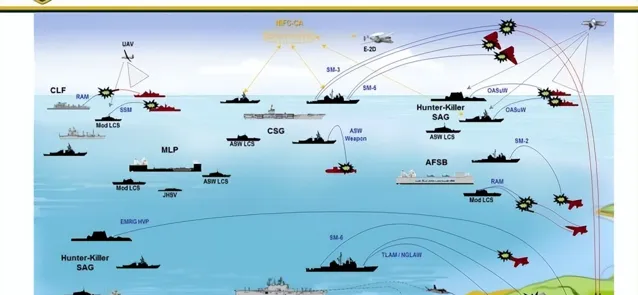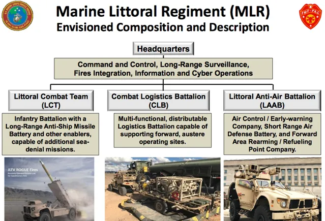 利用海軍陸戰隊遠征先進基地(Marine Littoral Regiment,MLR) 部署無人機、電子戰裝置和遠端火力支持,提供戰場情報並協助美軍航母編隊作戰。