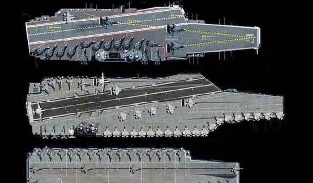 由上到下:山東艦、美國尼米茲級航空母艦、英國伊莉莎白女王級。山東艦和伊艦都是6.5萬噸級,大小差不多