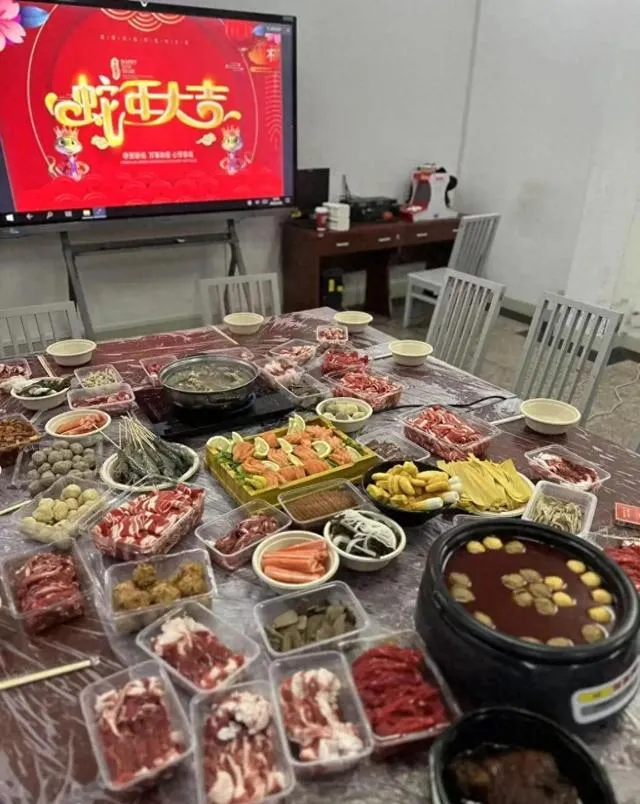 今年除夕夜,上海黃浦公安分局南京路步行街管理中隊的食堂熱鬧非凡。熱氣騰騰的兩鍋火鍋旁,擺滿了肉片和蔬菜。沒能回家過年的民警們,紛紛拿起手機與家人視訊通話,徐懿就是其中之一。
