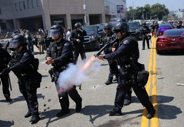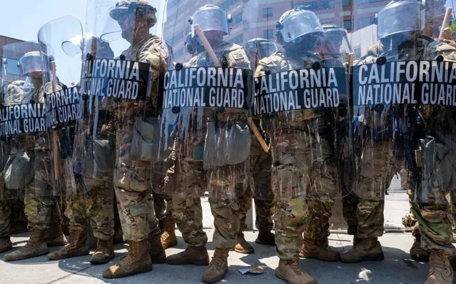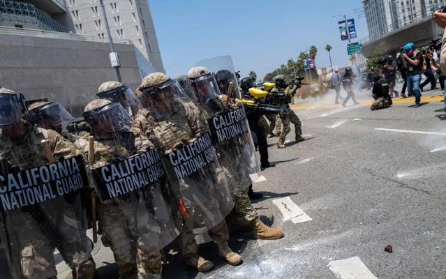 驅逐非法移民原本僅僅是美國政府的一場司法行動,然而川普卻用軍事鎮壓撕破憲政外衣,讓局勢一發不可收拾。為了師出有名,川普的幕僚團隊煞費苦心,其「國師」、白宮副幕僚長史帝芬·米勒更是將洛杉磯抗議行動定性為「造反」,川普就借著這個由頭,援引美國【反叛亂法】直接越過加州州長紐森,調動當地美國國民警衛隊參與行動。與此同時,作為川普心腹的美國國防部長赫格薩夫也來了「神助攻」,揚言要出動美國海軍陸戰隊輔助「平叛」,自此,這場移民沖突徹底升級為「國家平叛戰爭」。白宮繞過加州州長紐森,強制獲得了2000名國民警衛隊指揮權。在川普的命令下,國民警衛隊向投擲燃燒瓶的抗議者發射震爆彈,加州各地也是「揭竿而起」,城市街頭瞬間變成「戰場」。