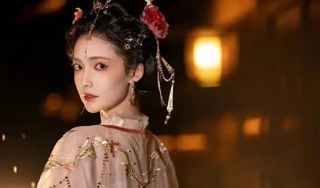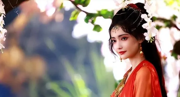 她身著一襲鮮艷的紅裙,上面鑲嵌著翠綠的墜飾。