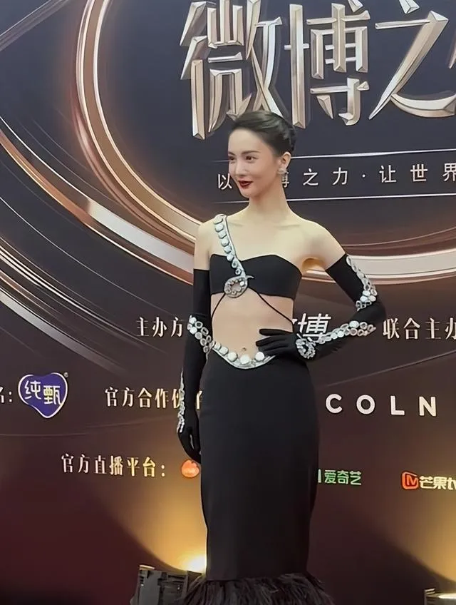 在2023年的微博之夜, 金晨一身黑色魚尾裙亮相全場,時尚又前衛,抹胸設計秀出肩膀,肩上腰上與手臂上點綴的鏡面亮片吸引眼球。