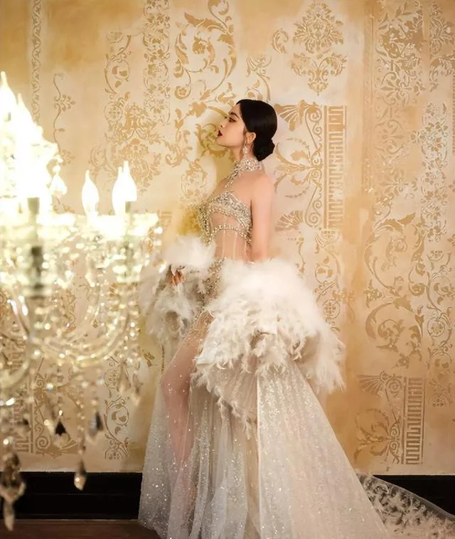 就譬如減肥前的古麗娜張,身材勻稱,一身白色羽毛鏤空禮裙將她凹凸有致的身材完美的展現了出來,盡顯優雅,精致與靈動。