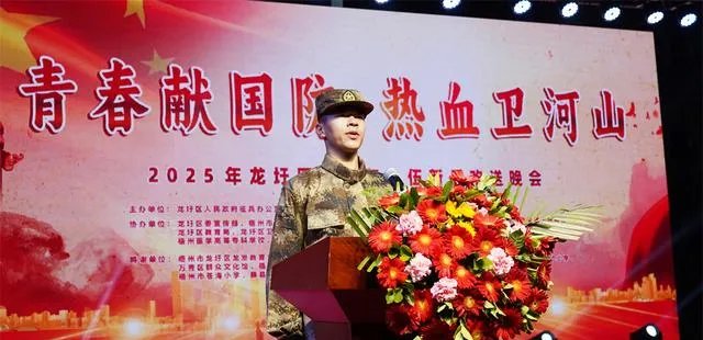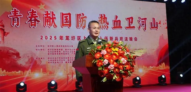 優秀青年立誌從軍,熱血男兒忠誠報國。近日,廣西梧州市龍圩區人民政府征兵辦公室在蒼海公園舉辦2025年上半年新兵歡送晚會。晚會以「青春獻國防,熱血衛河山」為主題,以文藝表演與榜樣教育相結合,為新兵踏上軍教征程註入信念與力量,彰顯地方黨政軍群對國防事業的高度支持。晚會在區委常委、人武部部長張軼群鏗鏘有力的致詞中拉開序幕。