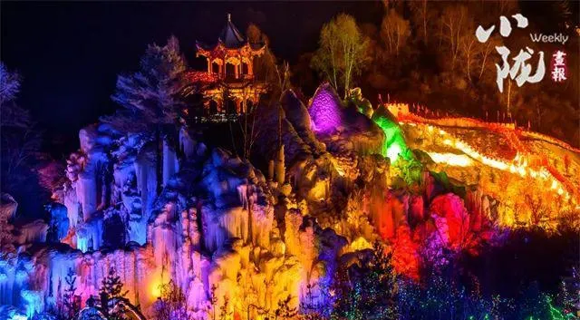 彩燈的點綴讓冰瀑變得五彩斑斕