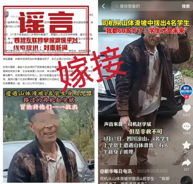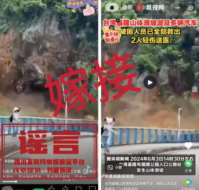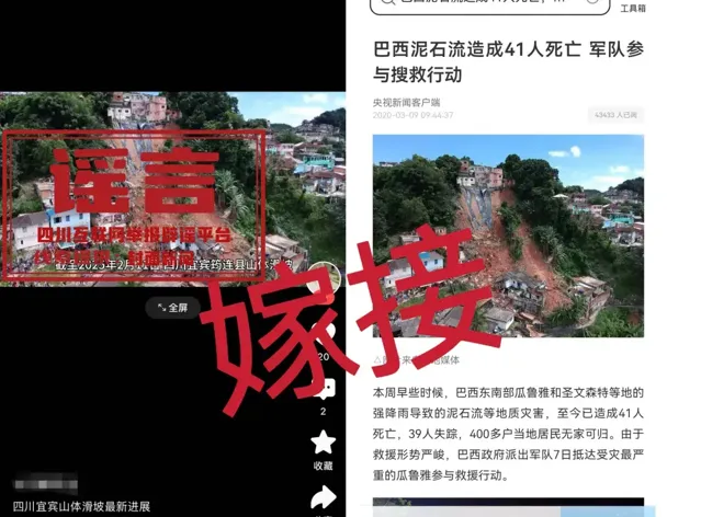 經核查,某帳號釋出的「四川宜賓山體滑坡最新進展」視訊畫面實際為2020年巴西土石流畫面;一帳號將2024年6月台灣基隆山體畫面「嫁接」至筠連山體滑坡畫面;某帳號釋出的「遭遇山體滑坡4名學生深陷泥潭 路過的司機趙學斌冒險將他們一一救出 」資訊,實際為2022年四川涼山一山體滑坡舊聞。