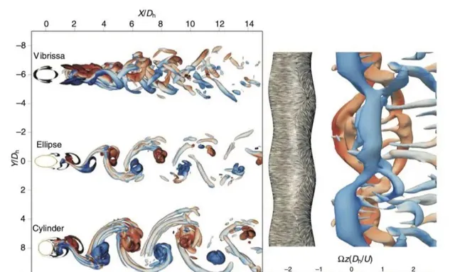 水流經過三種不同形狀物體——港海豹胡須、橢圓柱體和圓柱體時形成的渦流差異。波浪狀胡須透過打亂渦流群,讓渦流形成更遠,減少了振動 圖片來源:參考文獻 [3]