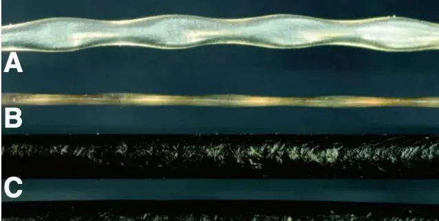 港海豹(AB)和加利福尼亞海獅胡須(CD)的結構差異 圖片來源:文獻 [2]