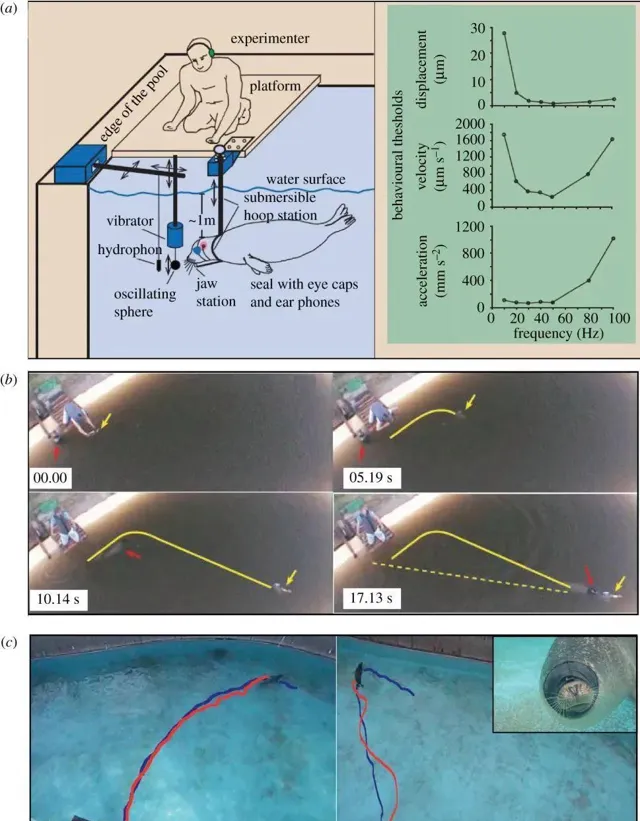 圖(a)圖中展示了一個水下實驗裝置。實驗者站在平台上,平台下方是水面,水下有一個潛水站,海豹佩戴眼罩和耳機以隔離視覺和聽覺幹擾。圖(b)這一部份展示了海豹追蹤運動的序列影像,時間戳從 00.00 秒到 17.13 秒 圖(c)展示了海豹追蹤時的兩種軌跡 圖片來源:參考文獻 [3]