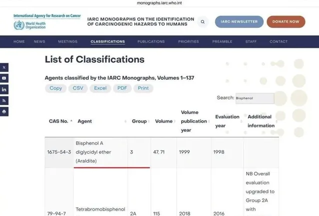 國際癌癥研究機構(IARC)將雙酚A歸為3類,即「未充分證明致癌性」。