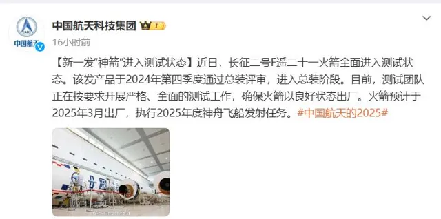 這不,中國航天科技集團又宣布了,長征二號 F 遙二十一火箭全面進入測試狀態,這枚火箭預計於 2025 年 3 月出廠,執行 2025 年度神舟飛船發射任務。