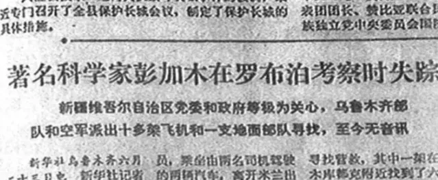 1980年6月23日,新華社向全國發了一條訊息:「著名科學家、中國科學院新疆分院副院長彭加木在新疆羅布泊的考察中失蹤,已經第7天沒有音訊了。」