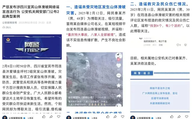 據微信公眾號「公安部網安局」2月13日訊息,經核查,2025年2月12日,網民秦某齊(男,48歲)為博取關註、吸引流量,冒用某自媒體公司名義,在某短視訊平台釋出筠連縣山體滑坡視訊,並謠稱:「重慶特大事故,八家人全部被埋」,造成該不實資訊傳播擴散,產生不良社會影響。 目前,相關屬地公安機關已對秦某齊依法查處。