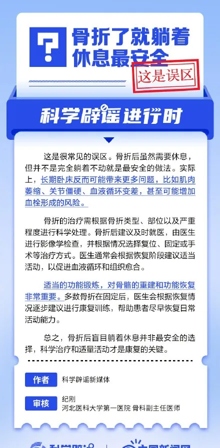 骨折後雖然需要休息,但並不是完全躺著不動就是最安全的做法。實際上,長期臥床反而可能帶來更多問題,比如肌肉萎縮、關節僵硬、血液迴圈變差,甚至可能增加血栓形成的風險。適當的功能鍛煉,對骨骼的重建和功能恢復非常重要。(轉自:@科學辟謠 @中國新聞網 )