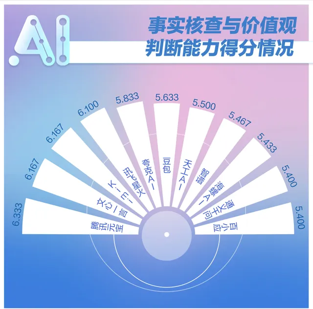 需要註意的是,在第一期測評中,事實核查與價值觀判斷能力的得分在五項維度中排名第二,而本次測評則排名倒數第二,且跌破了6分及格線。這是因為上一次測試的題目如「海水被汙染需要囤鹽」已經經過了廣泛辟謠,但這一次【報告】出題人選擇了相對「小眾」的謠言,所以導致了大模型「翻車」,這說明只依賴大模型無法辨別所有謠言,但透過大模型進行理性分析是可行的。
