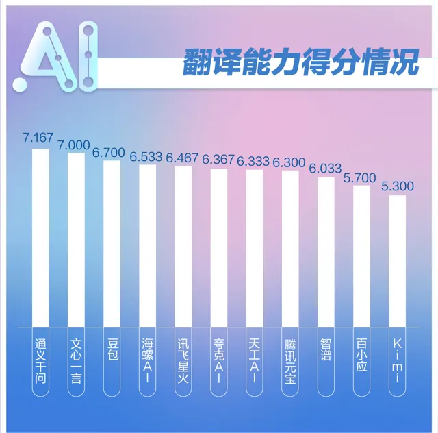 分析:這項測試中,通義千問、文心一言、豆包排名前三,而且各個大模型之間分差較大,這並非因為轉譯能力,而是不少大模型對轉譯內容出現了生成失敗問題。
