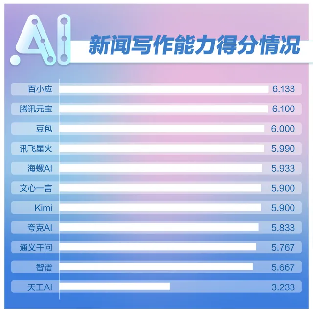 除天工AI外,各個大模型在該維度的得分差距最小,排名第一的百小應和倒數第二的智譜只差約0.5分,而資訊搜集能力維度測試中的第一二名差距就達0.5分。這說明在新聞寫作方面,不同大模型的輸出較為同質化,評委無法分清具體差距。