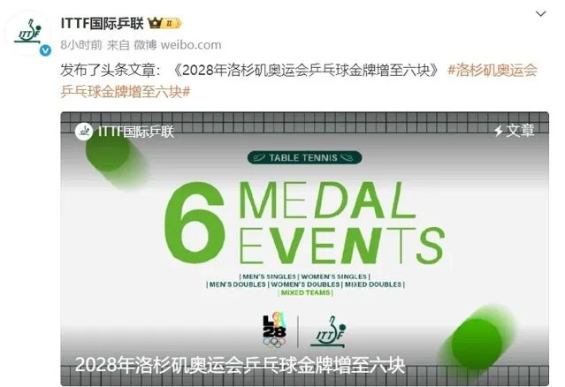 台北時間2025年4月10日,國際奧委會宣布:2028年洛杉磯奧運會桌球計畫迎來重大改革!金牌數量由原來的5枚增至6枚,這也是桌球在奧運會歷史上金牌數最多的一屆,並且極有可能延續其後!