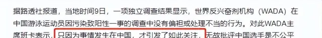 瑞士檢察官艾瑞克·科迪爾專門出來解釋,稱 WADA 審查時沒發現中國有違規行為,釋出決定時也未偏袒或維護中國運動員。
