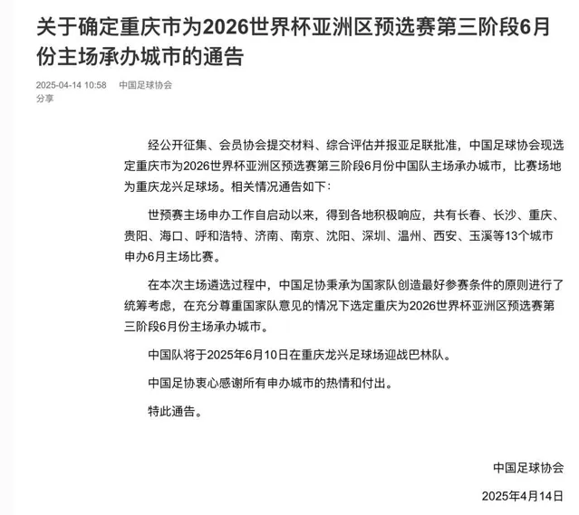 4月14日上午,中國足球協會正式官宣重慶成為2026世界杯亞洲區預選賽第三階段6月份主場承辦城市,比賽場地為位於兩江新區的龍興足球場。