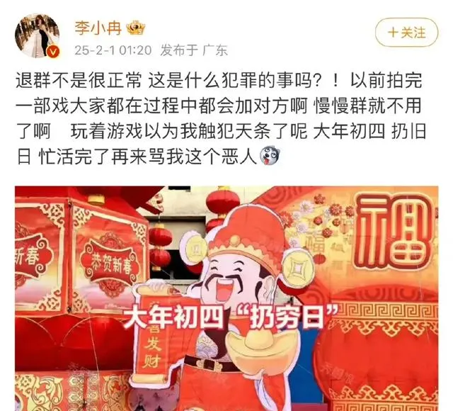「退群不是很正常,這是什麽犯罪的事嗎?!以前拍完一部戲大家都在過程中都會加對方啊,慢慢群就不用了啊。」