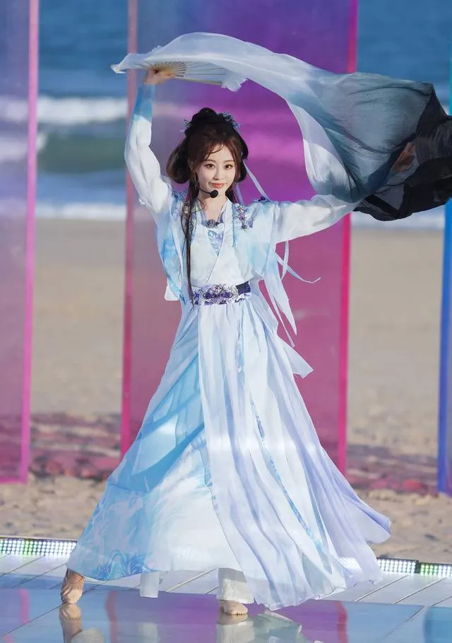 祝緒丹以改良漢服搭配金屬腰封,演繹【寄明月】扇子舞。紅黑撞色與電子樂融合,既有傳統水袖的柔美,又有機械腰封的硬核,卻被部份觀眾批評「割裂國風意境」。